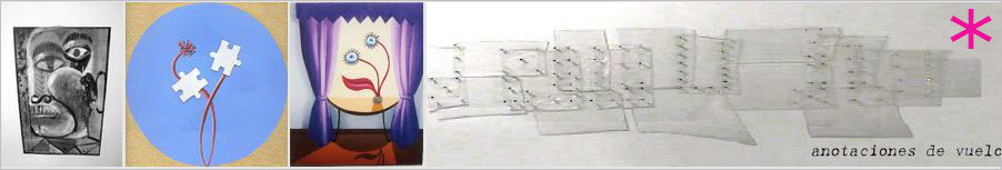 * "anotaciones de vuelo" es una pieza en p.v.c. que formó parte de la exposición "interior de una nave espacial abandonada" del año 2001. aquí aparece junto a otras imágenes de distintos años en un cut-up sacado del banco de datos de imagen en google+ a modo de una antología aleatoria.
